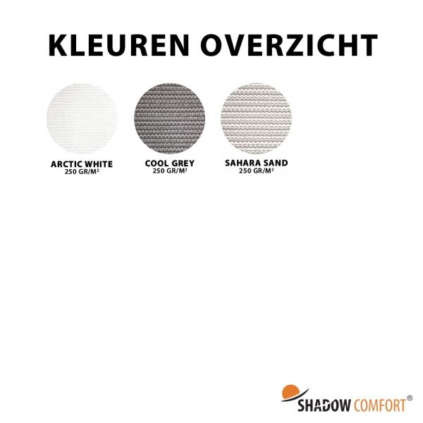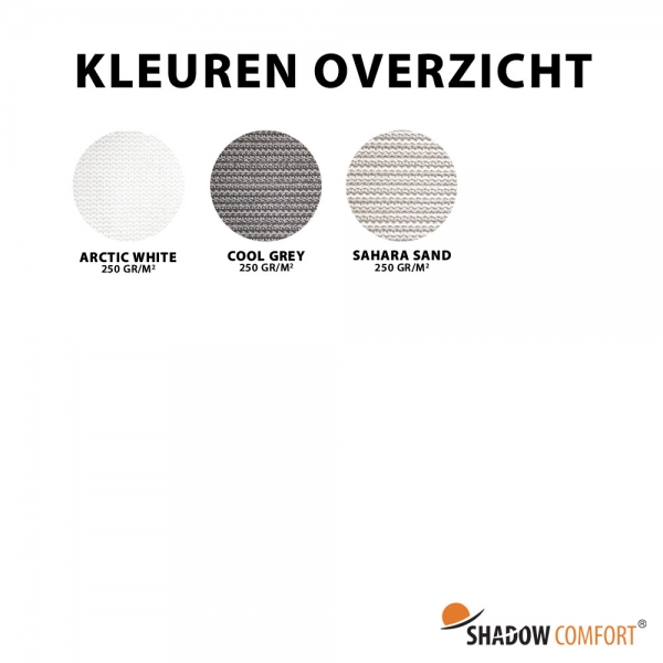 Shadow Comfort zonwering is gemaakt van een UV gestabiliseerd kunststof HDPE materiaal welke zeer geschikt is voor outdoor toepassingen. Deze HDPE geweven doeken verkleuren niet door de zon en hebben een schaduwfactor tot wel 93%. Onze hoogwaardige materialen zijn daardoor zeer geschikt als buitenoplossing waar het aan alle weersinvloeden onderhevig is. Onze producten kunnen dan ook met gemak 5 jaar buiten hangen!