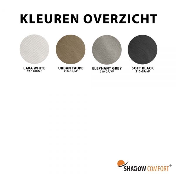 Dit ruime harmonicadoek is in vier moderne kleuren verkrijgbaar: Lava White, Urban Taupe, Elephant Grey en Soft Black. Dankzij de Solution Dyed technologie behouden de kleuren hun intensiteit, zelfs na langdurige blootstelling aan de zon. Goed om te weten is dat donkere kleuren meer schaduw bieden, terwijl lichtere tinten voor een zachtere lichtinval zorgen. Een lichte kleur doek heeft namelijk een hoge reflectiewaarde en een lage absorberende warmte.