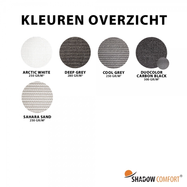 Een zeer populaire kleur is de kleur Sahara Sand, een licht naturel/zandkleurige tint geweven in combinatie met een creme kleurige draad. Deze sfeervolle kleur kan goed gecombineerd worden met vele andere tinten. Door de speciale weving van tapefilament draden is dit doek ook iets zichtdichter. Het doek heeft een gewicht van 250 gr/m2, windreductie van 90% en een schaduwpercentage van maar liefst 86%. UV stabilisatie 600Kly.