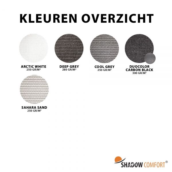 De kleur Cool Grey is een donkergrijze/antraciet kleur uit de Shadow Comfort collectie die geweven is in combinatie met een donkergrijze en lichtgrijze draad. Met deze kleur creëer je een stoere en industriële uitstraling. Geweven op 250 gr/m2 met tapefilament draden. Dit sterke kwaliteitsdoek met een hoge UV stabiliteit 1000Kly, windreductie 90% en schaduwfactor van 93% is uitermate geschikt voor toepassingen waarbij je van binnenuit naar buiten toe nog enige transparantie wilt hebben.