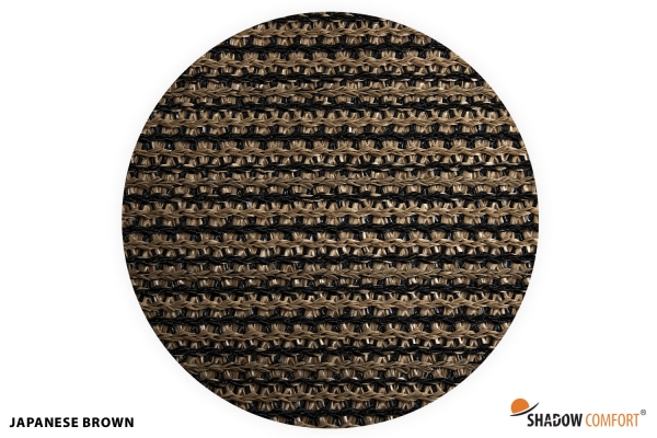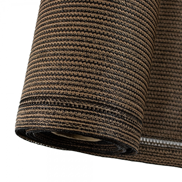 Een mooie donkerbruine warme tint geweven in combinatie met een zwarte draad. Door de weving van tape- en monofilament draden met een gewicht van 250 gr/m2 is ook dit kwalitatief hoogwaardige doek voorzien van een hoge schaduwfactor van 92% en windreductie van 90%. Onder andere zeer geschikt voor zonwering met enige transparantie naar buiten toe. Randafwerking boven- en onderzijde met knoopsgaten.