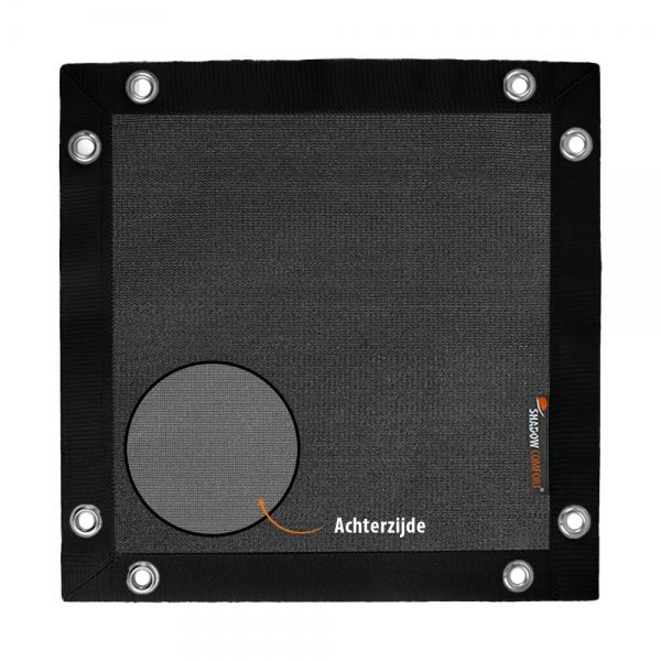 Het doek is geweven met diepe donkere antraciete draden in combinatie met een tint lichter antraciete draden. Doordat het een iets zwaardere kwaliteit doek is met een weefselgewicht van 300 gr/m2 en op een unieke manier geweven is, verschilt het aan beide zijden van kleur. De kleurstof Carbon Black is een veel toegevoegde pigment in kunststoffen en heeft van nature al een hogere slijtvastheid en is extra Ultravioletbestendig 1000Kly. Schaduwfactor 96,5%!