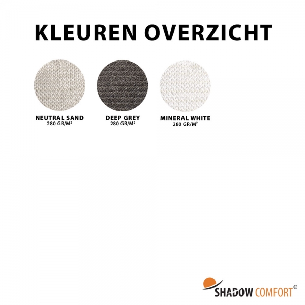 Het doek uit de Comfort serie van Shadow Comfort is geweven met zand- en creme kleurige draden waarmee je een zachte uitstraling met een aaibaar effect creëert. Dit HDPE geweven doek van 280 gr/m2 met tape- en monofilment draden heeft een schaduwpercentage van 77,5% en windreductie van 90%. UV stabilisatie 900Kly.