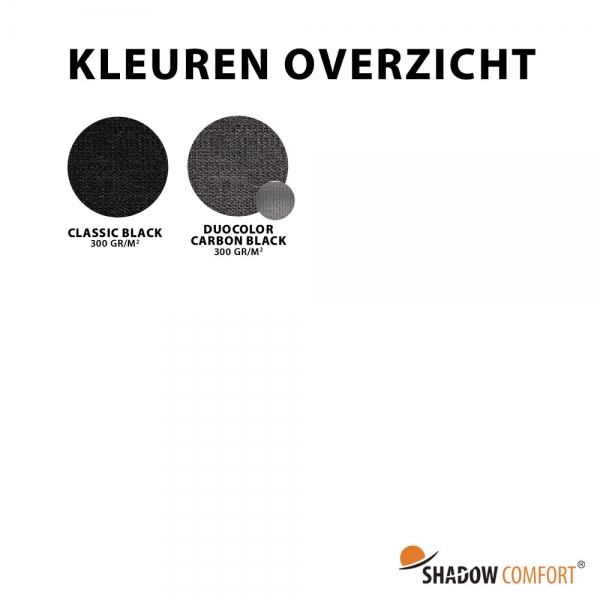 Het doek is geweven met diepe donkere antraciete draden in combinatie met een tint lichter antraciete draden. Doordat het een iets zwaardere kwaliteit doek is met een weefselgewicht van 300 gr/m2 en op een unieke manier geweven is, verschilt het aan beide zijden van kleur. De kleurstof Carbon Black is een veel toegevoegde pigment in kunststoffen en heeft van nature al een hogere slijtvastheid en is extra Ultravioletbestendig 1000Kly. Schaduwfactor 96,5%!