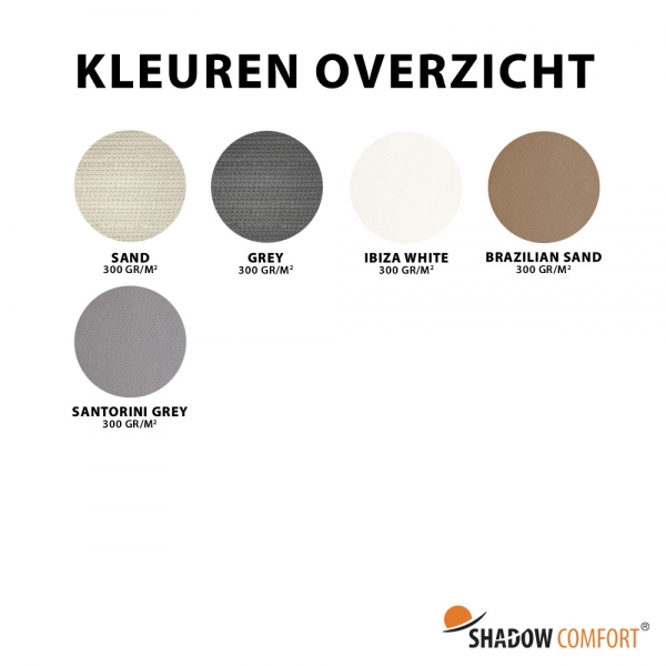 Warm Grey: een absolute bestseller is deze donkergrijze kleur met met een blauwe tint. Een veelzijdige kleur die direct karakter en charme toevoegt aan de omgeving. Deze donkergrijze tint zorgt ook voor een stoere industriële look. Zo is deze kleur ook heel makkelijk te combineren met de overige polyester schaduwdoeken in de kleuren island white, original camel en vintage grey.
