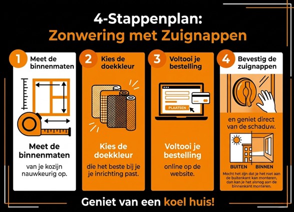 In de onderstaande afbeelding leggen wij je stapsgewijs uit hoe je een zonwering in huis haalt.